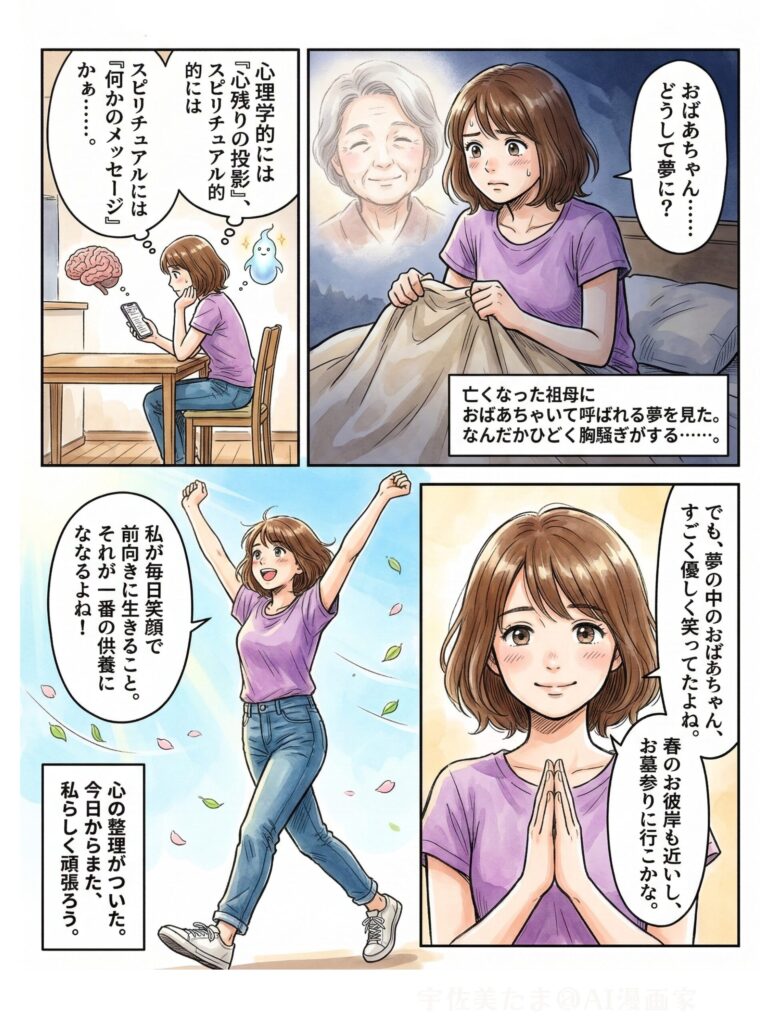 大切なのは、夢を通じて自分の心と向き合う機会にすることです。故人への感謝の気持ちを再確認したり、自分の生活を見直したりするきっかけとして、この体験を前向きに受け止めましょう。故人はあなたの幸せを願っているはずです。夢での出会いを大切にしながら、日々を前向きに生きていくことが、故人への最高の供養になるのではないでしょうか。