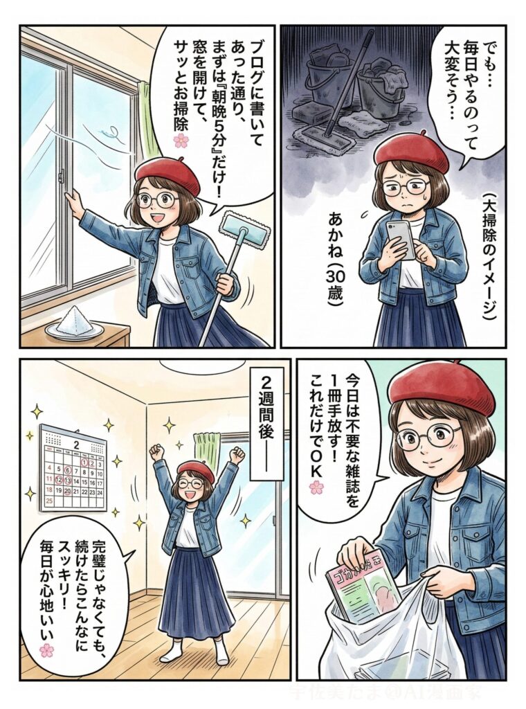 初心者が最も陥りやすいのが、「完璧にやろう」として燃え尽きるパターンです。初日に家中を大掃除し、翌日から疲れて何もできなくなる…これでは意味がありません。1日5分でも継続することが最も重要です。